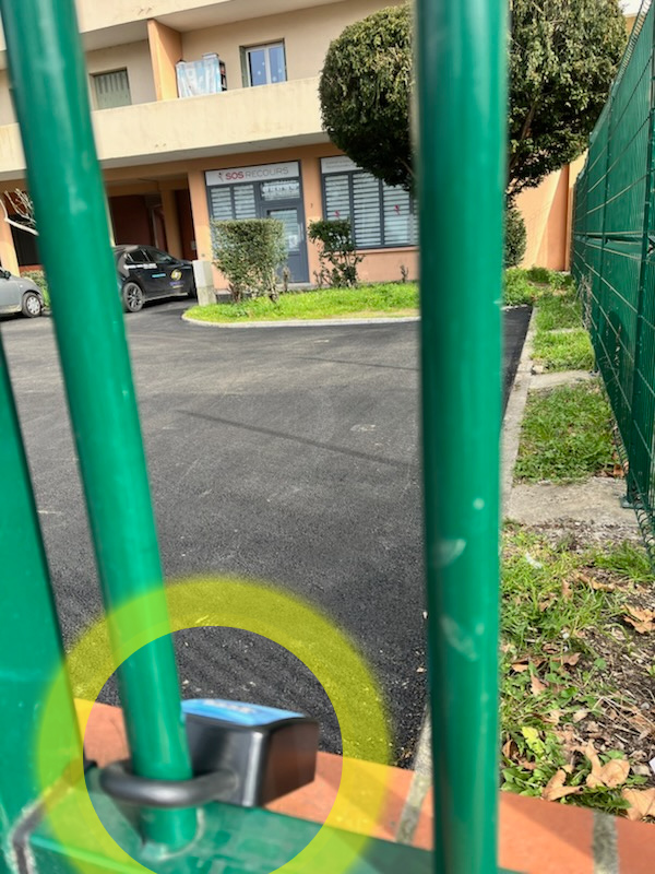 - Une keybox noire est fixée sur le grillage entre les numéros 6 et 7, facilement visible depuis le trottoir, sur la droite.